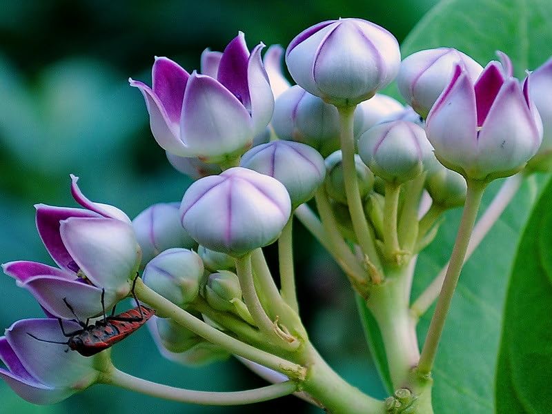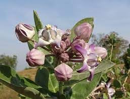 The Mandar plant (Calotropis gigantea), also known as Aak or Arka, is a large shrub that can grow up to 4 meters (13 feet) tall. It features clusters of waxy flowers, either white or lavender, with five pointed petals and a distinctive crown-like structure at the center holding the stamens.