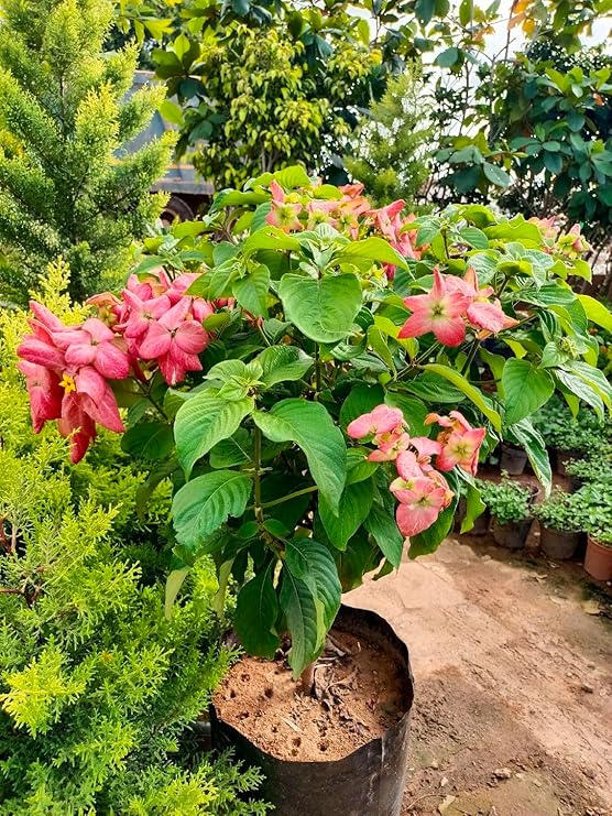 The Mussaenda Healthy Flower Plant with Tub is a highly decorative and eye-catching flowering shrub admired for its large colorful bracts, lush foliage, and long flowering season.